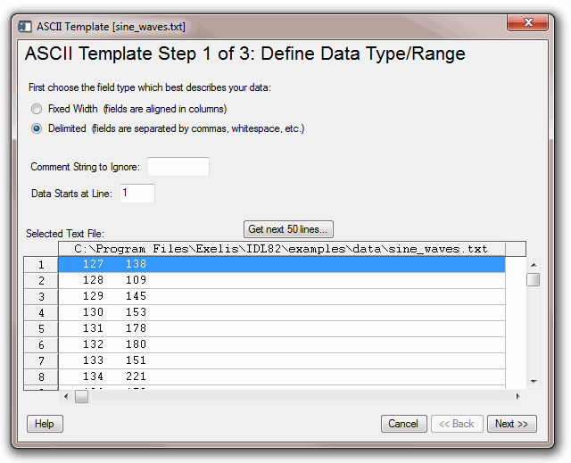 Select the ASCII file. In the Select File to Open dialog, select sine_waves.txt from the examples\data subdirectory of your IDL distribution. The ASCII Template window is displayed.